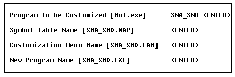Entering a new DOS file name allows you to create SNA_SND programs with different parameters for different uses. The original SNA_SND program retains the SNA_SND defaults. The new program you create contains your GENX customization.