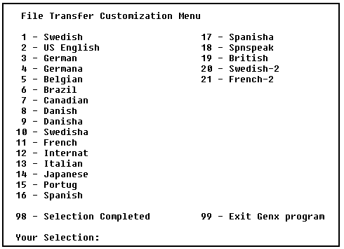 Note: When changing language character sets, you must start with the original SNA_SND program that contains the default US English character set before selecting a new set. Use a copy of SNA_SND.EXE and SNA_RCV.EXE from the distribution diskette each time you run GENX.