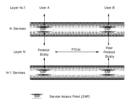 Each layer in the model provides services to the layer above it. In this way, any layer N is the service provider. The layer above it, N+1, is the service user. Layer N+1 accesses the services provided by layer N at Service Access Points (SAPs). Each SAP is identified by a unique address.