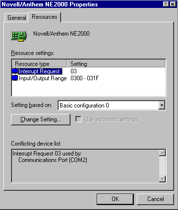 6. Click the Resources tab and check the resource settings for your LAN card. If the resource settings are incorrect, change them to the correct settings.