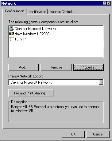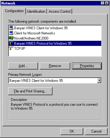- Select the Banyan VINES Protocol for Windows 95 and click Properties.