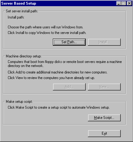 The system copies the Windows 95 files to the network. When the Server Based Setup dialog box appears, click Exit. Go to "To Install the Banyan Client on the Network."