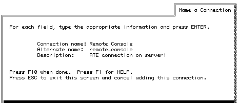 1. Enter a name for the connection. For example, call the connection Remote or RemoteConsole. Use the backspace, insert, delete, and arrow keys to make corrections as needed.