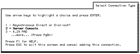 2. Press ENTER. Do not associate a script file with this connection. The Select Connection Type screen appears.