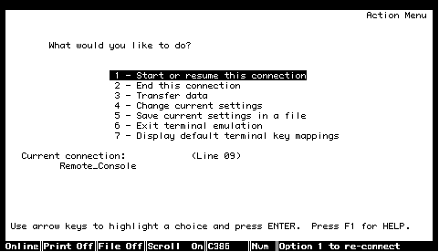 After you issue the HOSTS command, the Select a Connection menu appears. Select the remote console connection.