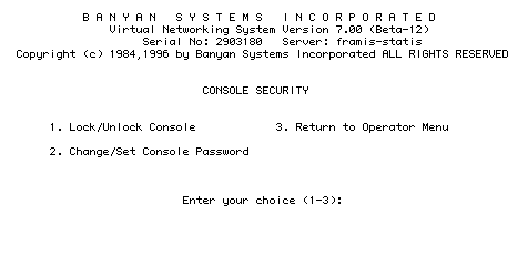Caution: Do not forget the system console password. If you do, you cannot regain access to the Operator Menu functions without intervention from Banyan customer support.