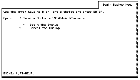 Note: To cancel the procedure once it is in progress, press CTRL-C. If you cancel the confirmation test, the tape retensions, the backup stops and the Backup Menu appears. A message indicates that the backup has failed the test. The backup may be readable, but because you did not allow the test to complete, the test did not succeed. Confirm readability of the backup at a later time.