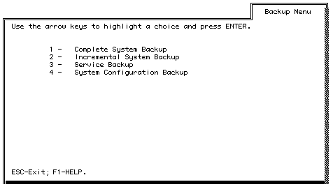 Incremental system backup - Backs up the changes that have occurred in the system data following the last complete backup. Does not back up operating system executables. You can select from among three settings when configuring an incremental backup range. For more information, refer to "Incremental Backups" later in this chapter.