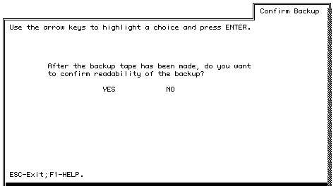 Note: If you previously scheduled a backup for this time, it does not begin until you remove the tape or diskette and verify that it is no longer in the drive by pressing ENTER. This prevents a scheduled backup from accidentally overwriting the media being confirmed. This is only true when confirming tapes manually. When you choose to have a tape automatically confirmed following a scheduled backup, you are not prompted to verify removal of the tape after the test completes.