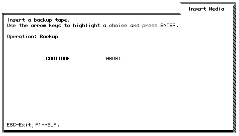 If the backup does not fit on the current tape or diskette, the Insert Media Screen appears. A message informs you that the space on the tape or diskette is exhausted. If you are using tape, the tape automatically rewinds. You are then prompted to remove the media from the drive. Remove the tape or diskette and label it.