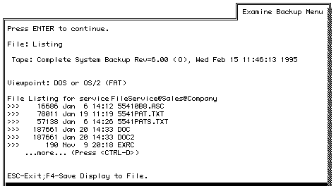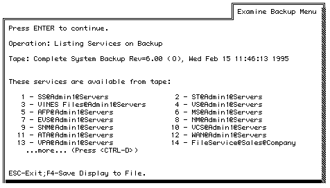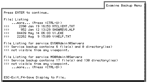 8. When you are finished viewing the list of files, press ENTER to complete the procedure. The Examine Backup Menu appears. You can save the list of services on the backup to a file. Refer to the "To Save the List of Files on the Backup to a DOS File" which follows.