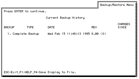 Note: A complete system backup overwrites any previous history up to and including the last complete system backup. Incremental backups are recorded up to and including the last complete system backup. Service backups are never listed. A complete system rebuild also erases the current history. (For information on a system rebuild, see Chapter 7.)