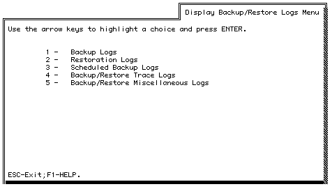 2. Select Display Backup/Restore Logs. The Display Backup/Restore Logs Menu appears.