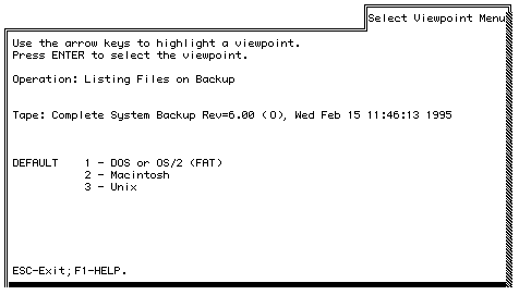 You can view the files from one of three file system viewpoints: DOS or OS/2 File Allocation Table (FAT), Macintosh, or UNIX. Viewing files from a specific viewpoint is useful if you need to restore files for a particular platform.