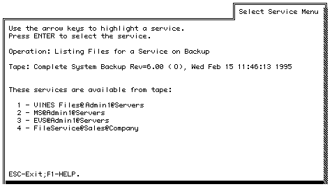 You can save the list of services on the backup to a file. Refer to the "To Save the List of VINES Services on the Backup to a DOS File" which follows.