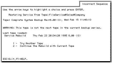 - If you have an incremental backup to load, insert the next tape or diskette in the backup series. Continue with step 12. If the tape you insert is not the next tape in the current backup series, the Incorrect Sequence screen appears, prompting you to load another tape.