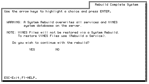 You can replace VINES Files by rebuilding the service. However, you cannot rebuild VINES Files as part of a complete system rebuild. After rebuilding the complete system, you must reload VINES Files from your release media.