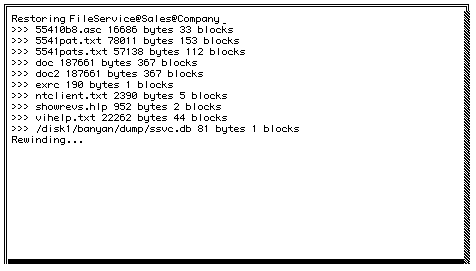 Because VINES Files is not restored during a complete system rebuild, you may not need to load a complete system backup in its entirety. For example, if your complete backup spans six diskettes, the rebuild may only use the first diskette, because the final five diskettes may contain VINES Files information. For information about re-installing VINES Files, refer to "Re-installing VINES Files from Release Media" in Chapter 11.