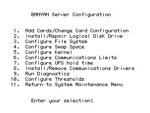 2. Choose Configure/Diagnose Server. The BANYAN Server Configuration Menu appears.