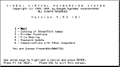 Once logged in, you may see the VINES Main Menu, a system prompt, or a customized menu, depending on how your administrator set up your network environment.