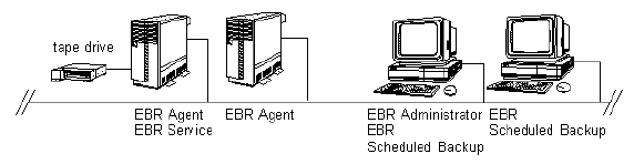 In this document, the term "EBR client" can refer to either a VINES server running the EBR agent or a VINES workstation running EBR or Scheduled Backup programs. An EBR service may have many clients, and these clients can be any combination of workstations and VINES servers. EBR clients, whether on workstations or servers, have similar configuration and management requirements from the EBR administrator's perspective. Nearly all administrative tasks can be handled through the EBR Administrator program