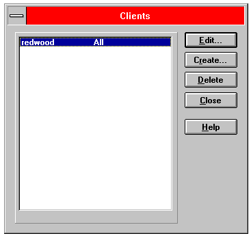 1. Select Setup from the Client menu. The Clients dialog box appears, displaying the names of all clients already known to the EBR service on redwood. Note that redwood is on the client list.