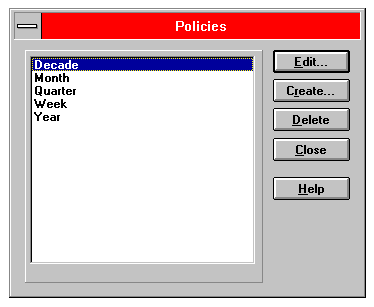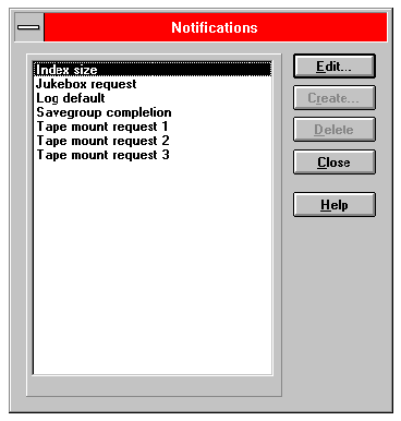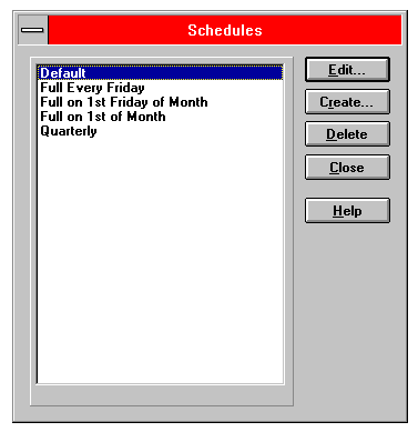 This dialog box displays the names of the schedules identified by the EBR service you are administering. Five backup schedules are provided for your convenience. You may delete all of the schedules except the one named "Default."