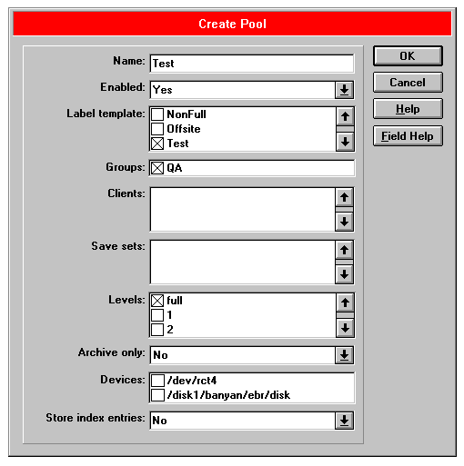 Suppose you want to create a pool named "Test" that selects all the full backups from a group called QA. The QA group backs up all the data from systems in the quality assurance lab. You want to sort the full backups so you can have a complete set of backup tapes to store in a secure vault. You plan to keep data for a year in case it is ever needed, but do not anticipate a need to recover it.