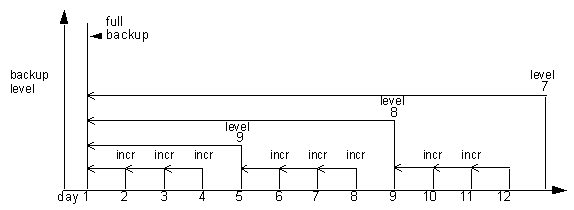 The diagram that follows illustrates how backup levels work. You may use a backup scheme that includes occasional full backups followed by level [1 to 9] and incremental backups during the cycle. Different backup levels allow you to trade off the number of backup volumes and amount of time required to complete a backup, versus the number of backup volumes and amount of time it takes to recover from a loss of files.