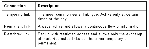 Network mail automatically chooses the best route for exchanging messages, based on the way the servers in the network are connected. Servers that communicate through serial links can have permanent, temporary, or restricted connections. Each type of connection is described in Table 4-2.