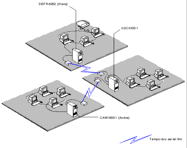 Andre Girouard at WCTCA in Winnepeg wants to send a message to Hans Kruspig at WTCDE in Frankfurt. Andre' s mail service resides on server CAWIN001 and Hans' on server DEFRA002. Andre must route the message through the remote server USCHI001, which connects to CAWIN001 and DEFRA002 at different times.