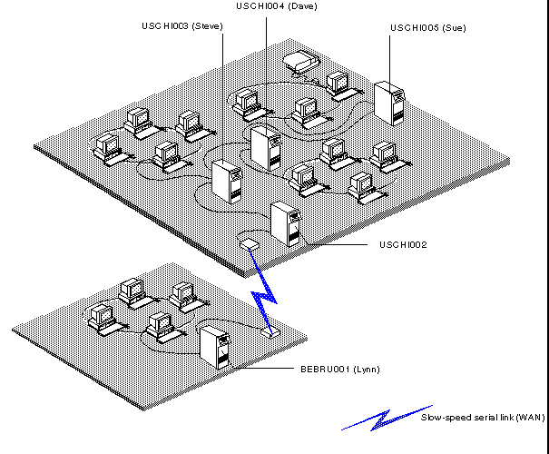 By force routing the message, Lynn prevents the origination mail service (on BEBRU001) from sending three copies of the message over the slow link. Instead, only one copy of the message is sent over the high-cost line and is copied to the three recipients over the low-cost LAN.