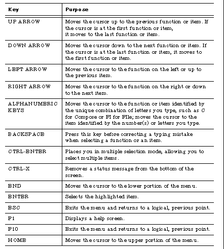 Table 1-1. Menu Selection Keys, describes the keys you need to select functions and move within mail menus.