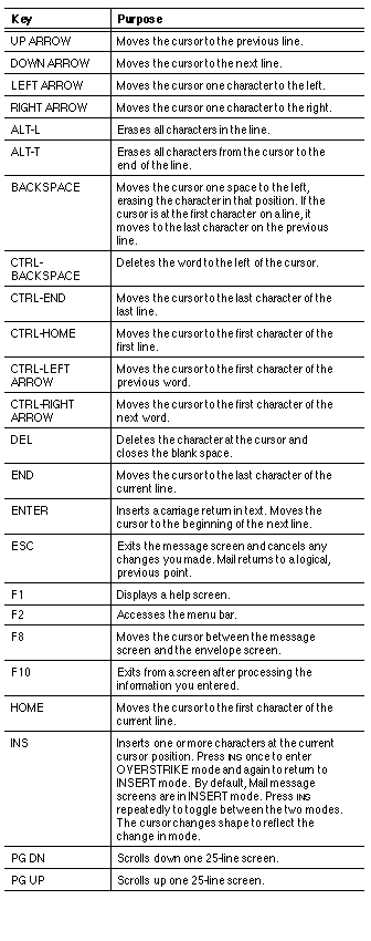 Mail editing keys enable you to enter addressing information and message text in these screens. Table 1-2. Data Entry Screen Keys, describes the keys that you use when you enter addressing information in data entry screens.
