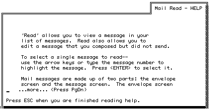 Many mail screens provide on-line help. The Help feature consists of short descriptions of mail functions and guidelines for using mail.