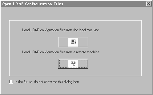 When you start LDAP Configuration Manager, the Open LDAP Configuration File dialog box, shown in Figure 2-1, asks you to select the type of configuration you want to do-local or remote.