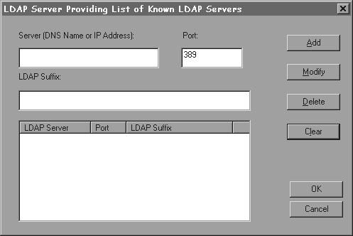 The buttons on the LDAP Server Providing List of Known LDAP Servers dialog box (Figure 2-3) do the following: