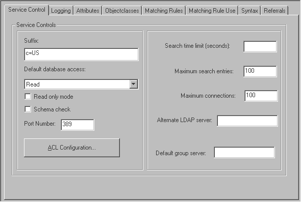 Use LDAP Configuration Manager to select appropriate configuration settings for your service: service settings, Access Control List (ACL) configuration, logging options, and referrals ![]()