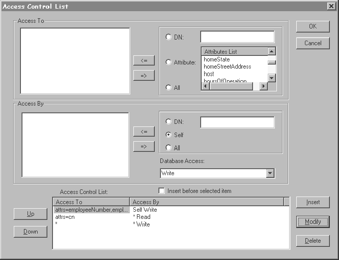 Access Control List - Lists the existing entries on the access control list. Entries are listed in the order in which they are searched by LDAP when a client requests an LDAP operation. Any number of entries can appear on the list. If the Access By column is empty, the default database access setting is applied for all users. By default, all users have Write access to the directory as specified by the default database access setting on the Service Control dialog box. Use the Service Control dialog box to change the default database access setting for the service.