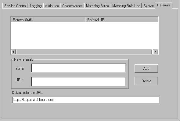 The Referrals dialog box, shown in Figure 2-12, lets you define and manage LDAP referrals. Referrals enable LDAP to handle a request for data that is not available in the local database, by returning an address to another LDAP service that has the requested data.