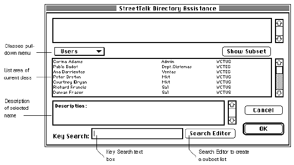Table 3-1 describes the elements of the StreetTalk Directory Assistance window: