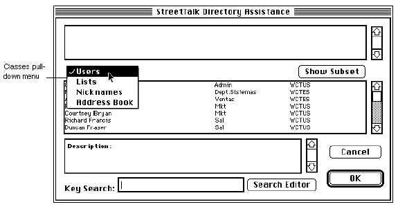 | Classes menu | Use the Classes pull-down menu to choose the class of StreetTalk names you want to display. |