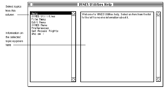 On-line help is available at any time for VINES applications running on your Macintosh workstation. To view on-line help, choose the help command from the Apple menu, or press Cmd-H.