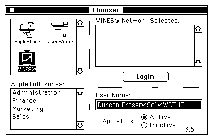 2. Click the VINES icon to select it. The Chooser displays a Login button to the right. Make sure the AppleTalk option is set to Active.