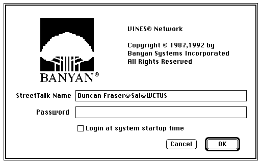 If your user name appears in the User Name text box in the Chooser window, the same name appears in the StreetTalk Name text box in the VINES Login dialog box.