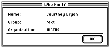 The Who am I? window appears, displaying the name, group, and organization of the user currently logged in to the network at your Macintosh: