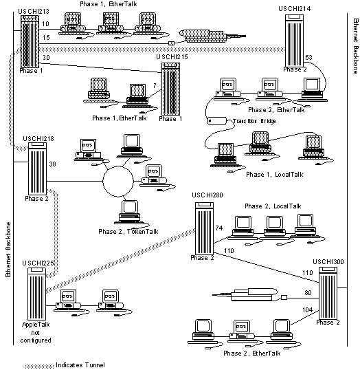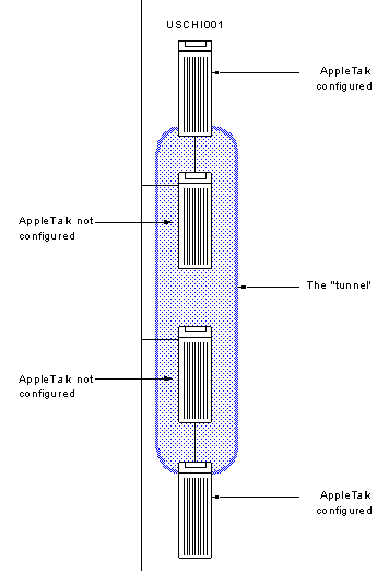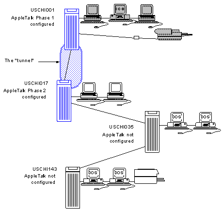 Another use of tunneling is to connect two AppleTalk LAN segments that are running different AppleTalk phases. In Figure 2-15, for example, USCHI001 is running AppleTalk Phase 1. USCHI017 is running AppleTalk Phase 2.