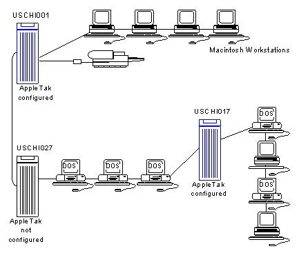 For example, in Figure 2-13, AppleTalk ports have been configured on server USCHI001 and server USCHI017. An AppleTalk port has not been configured on Server USCHI027, which is between the two.