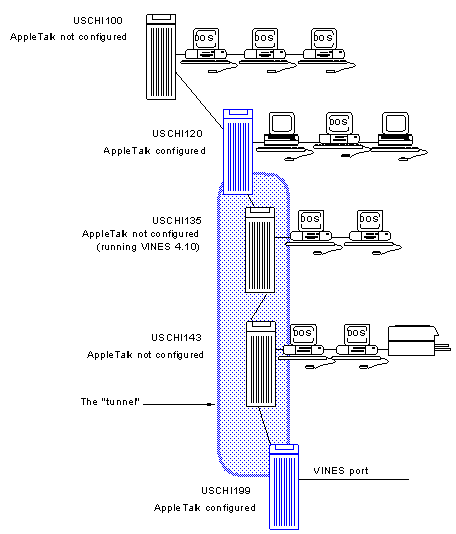 Chapter 3 describes the procedure for configuring AppleTalk ports to allow tunneling through VINES.