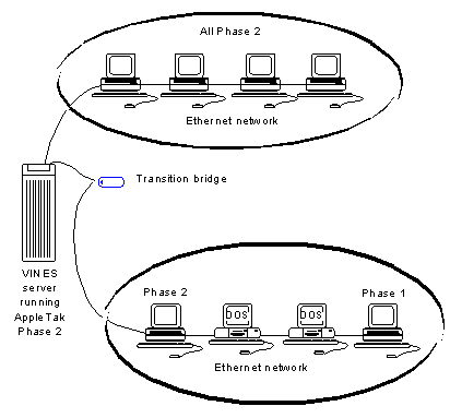 If you cannot convert all of your network at once, you can use a transition bridge. On very large networks, transition bridges are often used as temporary measures while the network is slowly being converted to Phase 2. Using transition bridges on a permanent basis in your VINES AppleTalk network is not recommended.